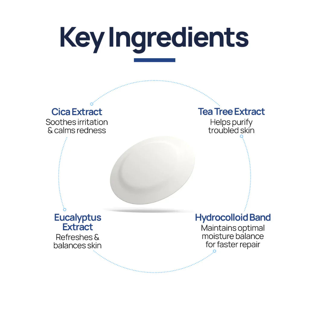 Ultra-thin, transparent hydrocolloid patches that calm blemishes, protect skin, and stay invisible under makeup overnight.